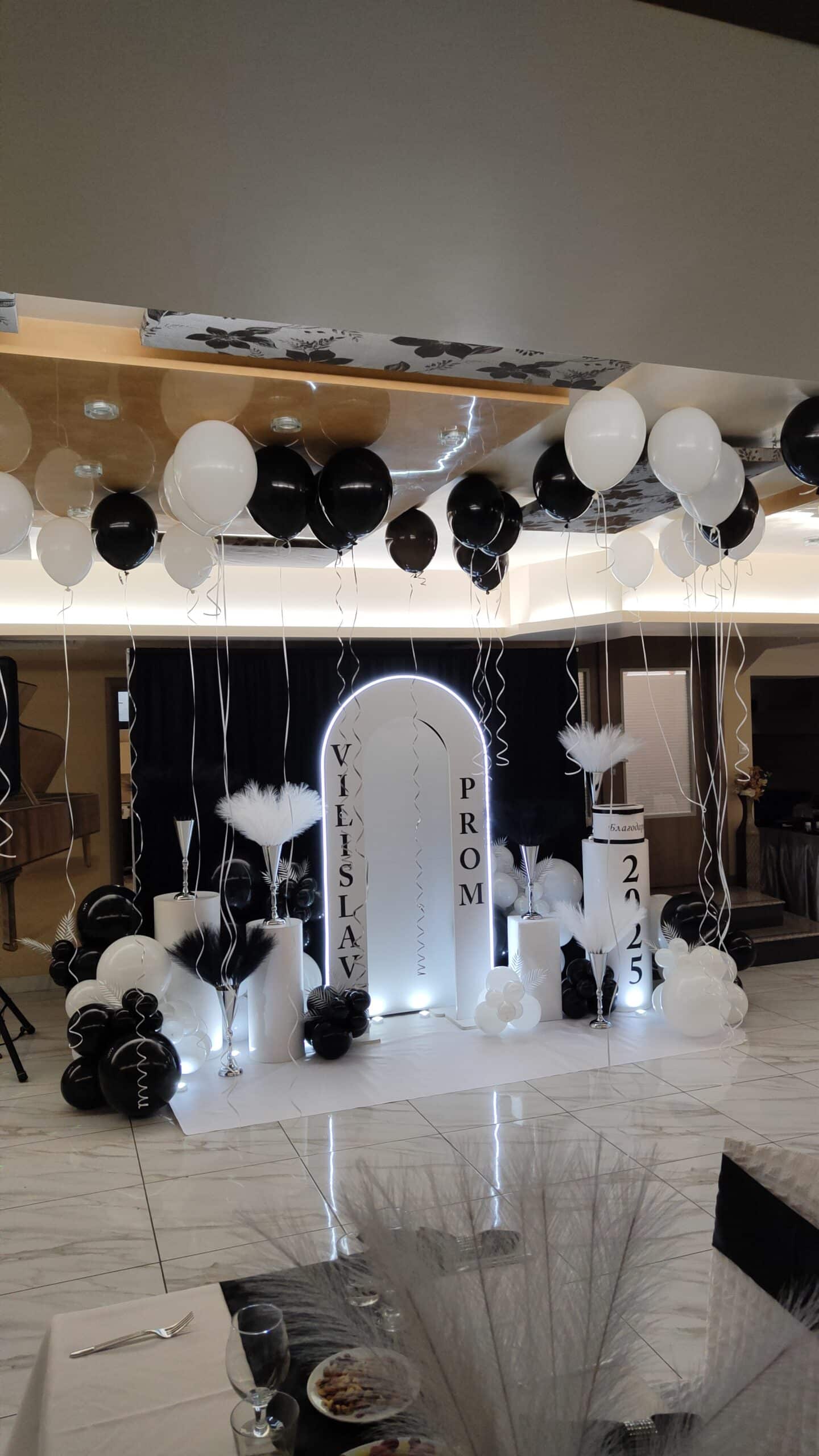 Украсата са абитуриетски бал може да включва фото кът за снимки с гостите от арка с балони ,цветя, лампички, балони с хелий и други елементи, както и украса за масите на гостите и подаръчета за гости.
