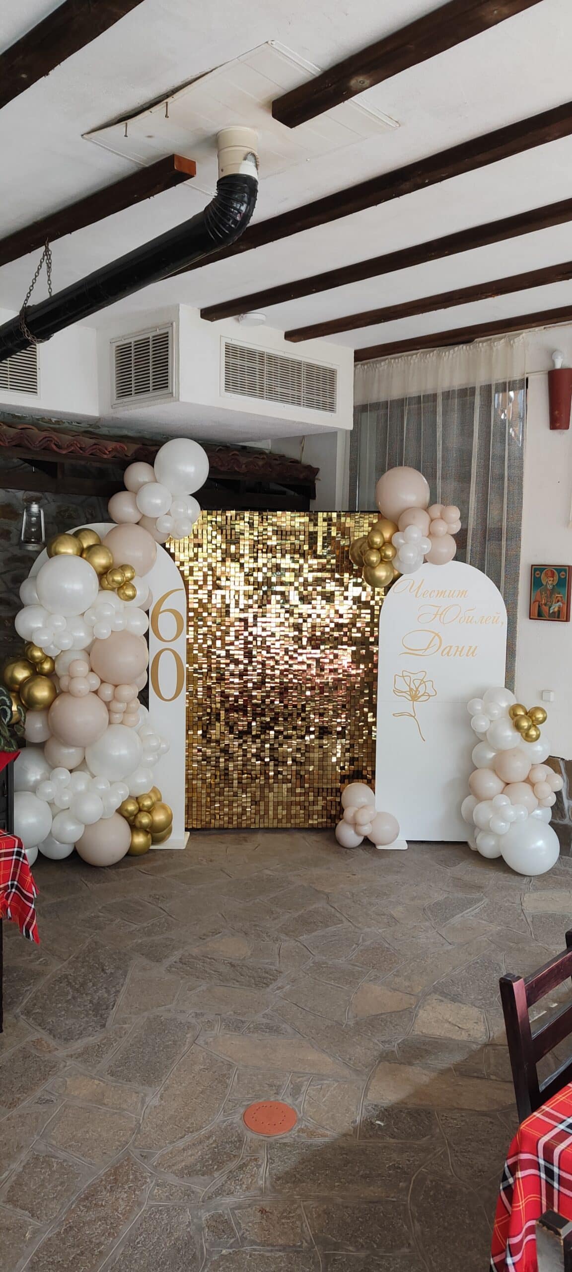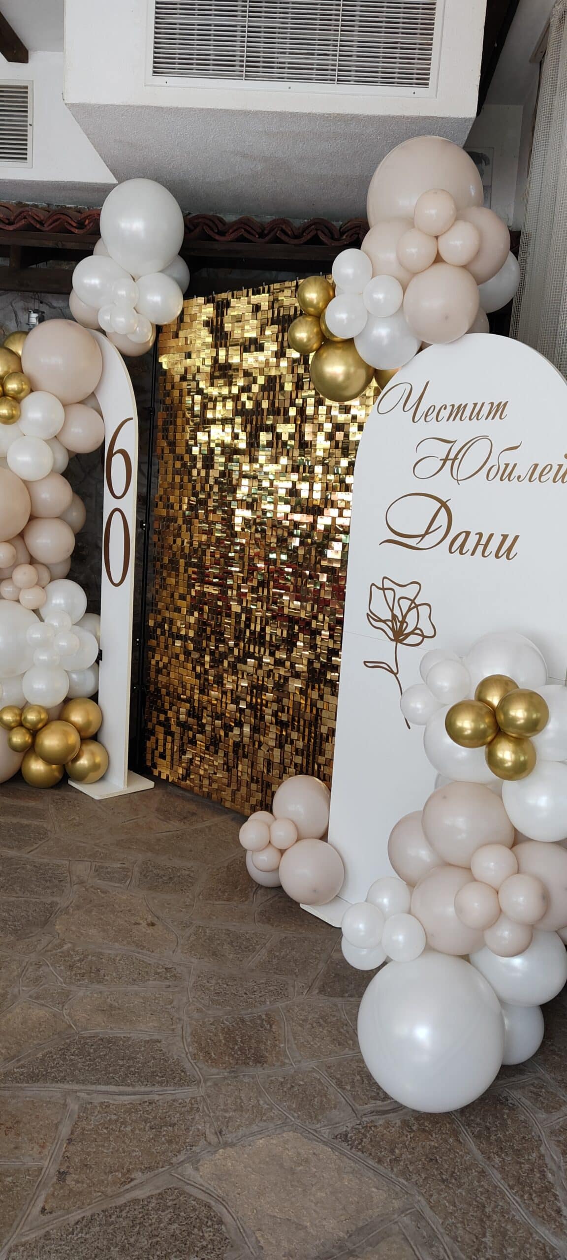 Разполагаме с богат асортимент от различни модели арки -кръгли, квадратни, елипсовидни, пайетени стени в злато и сребро; цветови композиции от балони,фолиеви и латексови балони, колони от балони, балони с хелий; разновидности на красиви и качествени изкуствни цветя -рози, хортензии ,божури и др.; светещи лампички, панделки, пеперуди и много други.