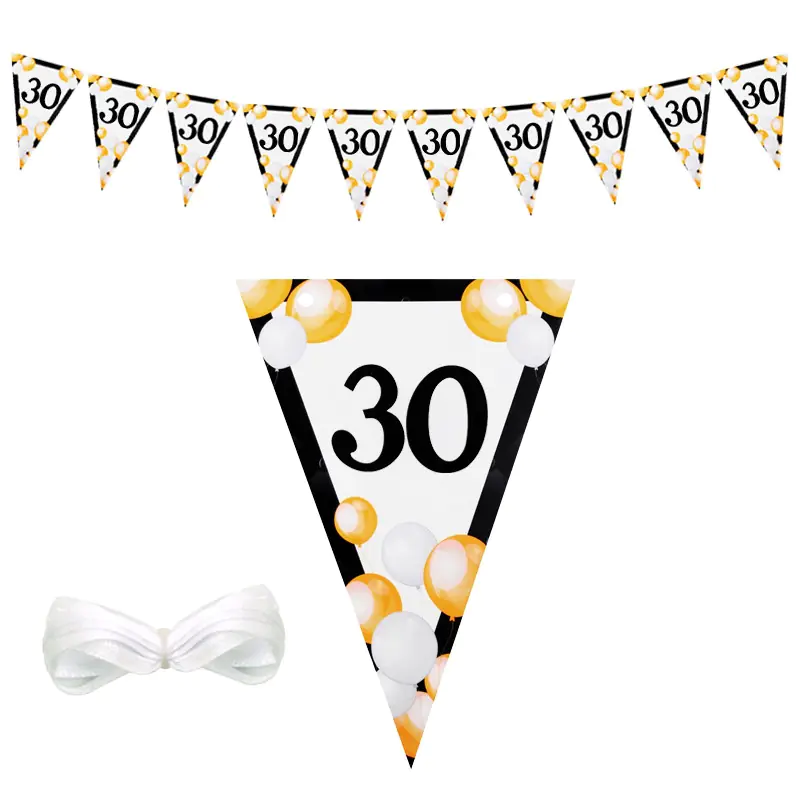 Банер с надпис „30“ и индивидуални флагчета, които се комбинират чрез лента участваща в компректа. Подходящ за закачане на всякакви повърхности и лесен монтаж.
