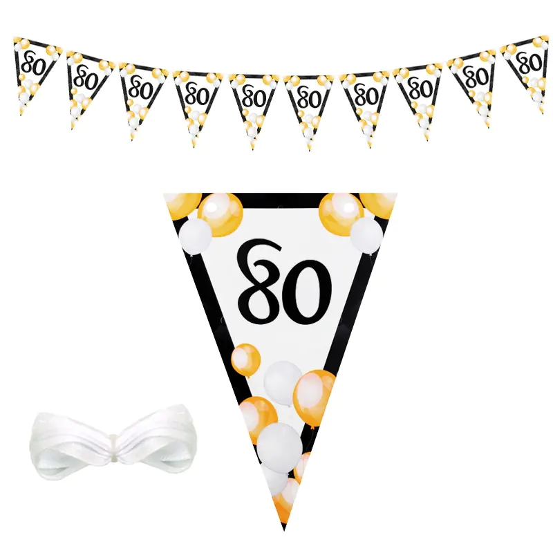 Банер с надпис „80“ и индивидуални флагчета, които се комбинират чрез лента участваща в компректа. Подходящ за закачане на всякакви повърхности и лесен монтаж.