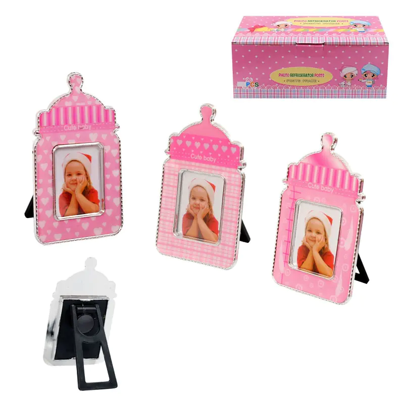 Розова рамка за снимки с форма на бебешко шише, която може да се използва като магнит или да стои на маса. Идеална е за поставяне на снимка на бебе и е подходящ подарък за бебешки празненства или като сувенир. Рамката е с размери 5×11 см.