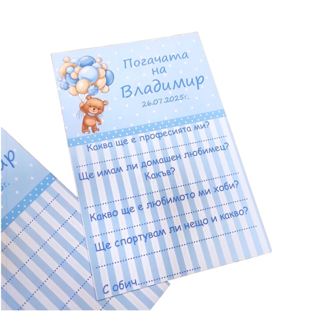 С картичките всяки гост може да напише своите пожелания и съвети към бебето – мил спомен, който мама ще запази за бебето си. Изработват се по поръчка – цветове и дизайн.
