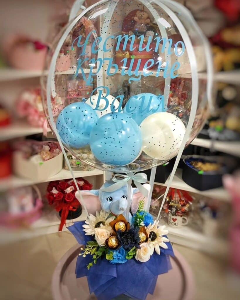 Кристален бъбъл балон за Кръщене погача Рожден ден Изненадайте родителите с уникален и стилен подарък – подаръчна кутия с бонбони Ferrero Rocher, мече и балон.