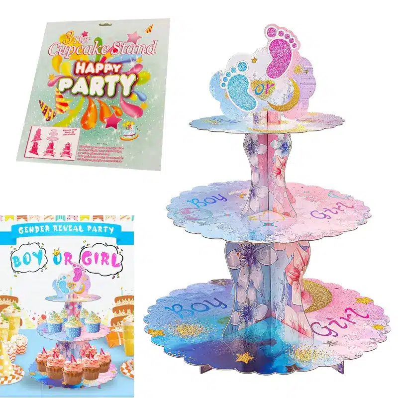 Стойка за мъфини за разкриване на пола на бебе. Размер на стойка – 39 см. на 29 см. Подходяща за декорекция на партито за разкиване на пола.