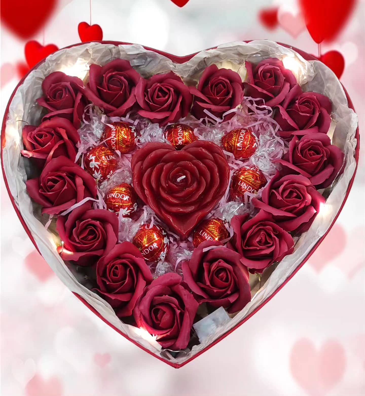 / Кутия сърце със сапунени рози, бонбони и свещ