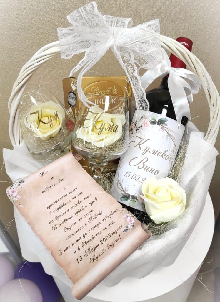 Красива подаръчна кошница– покана за кумове.
