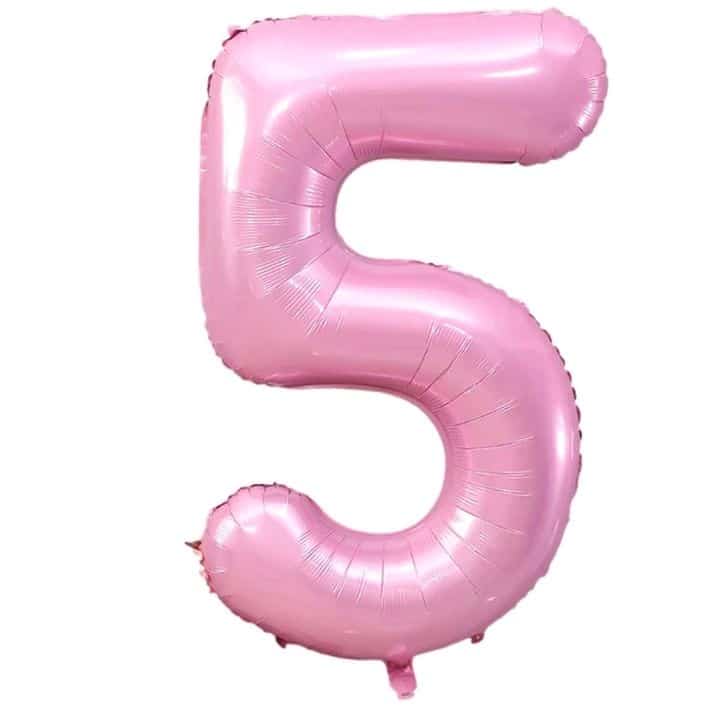 Лъскав фолиев балон цифра в розово. Подходяща за рождени дни, годишнини, юбилейни събития или други тържества, където числото „5“ е част от повода. Позволява надуване с хелий или въздух.