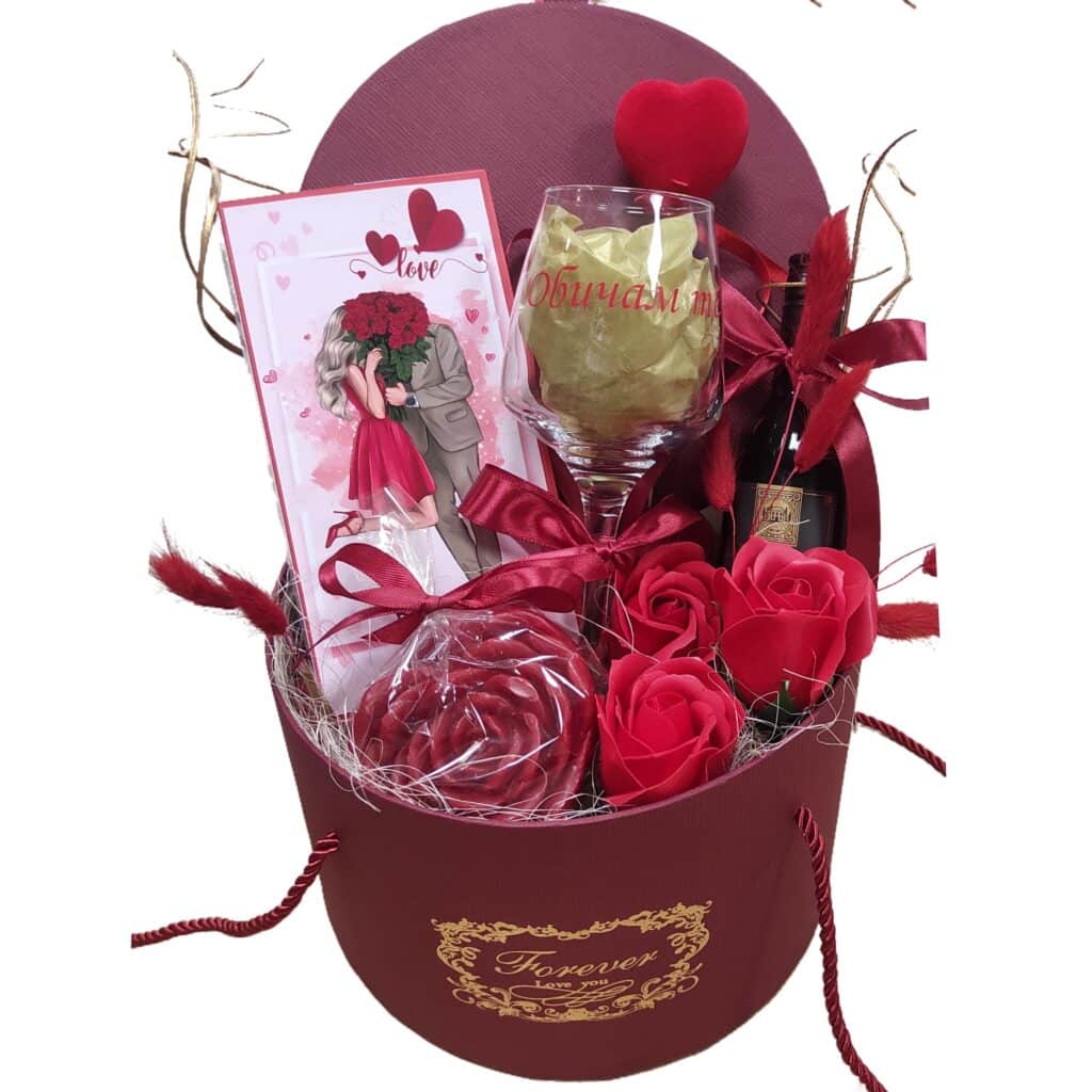 Подаръчна кутия съдържаща бутилка вино, чаша с надпис „Обичам те“, картичка с изображение на влюбена двойка и надпис „love“, сапунени рози, червено сърце свещ и декоративни елементи за романтичен повод.